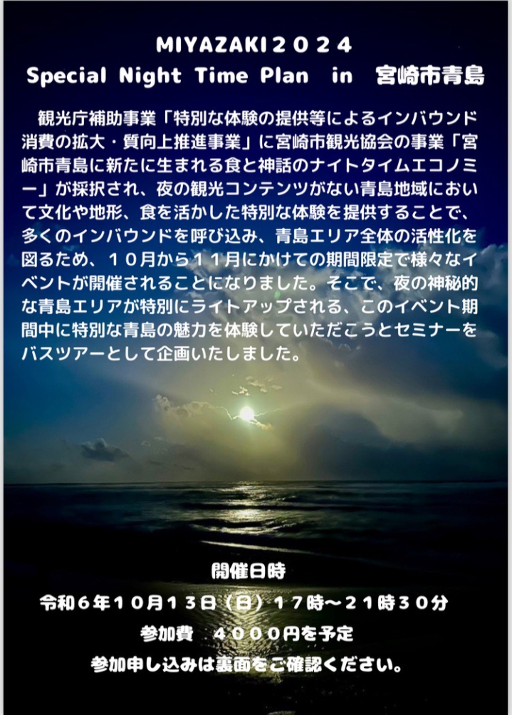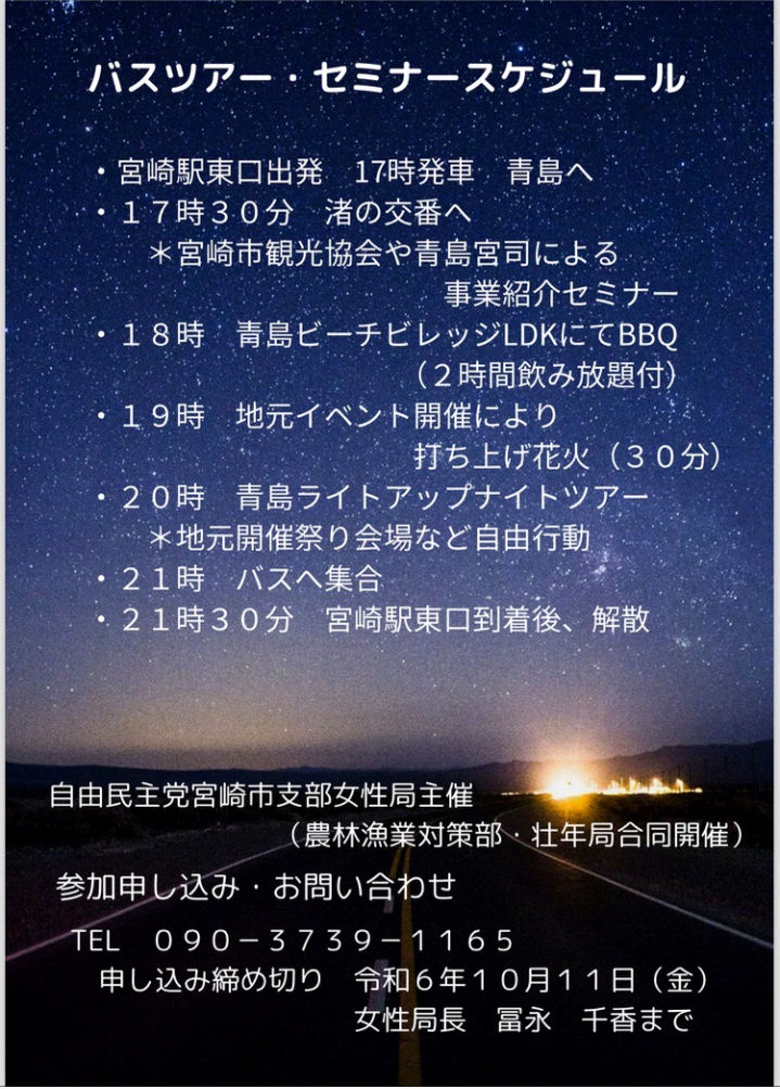 令和6年度10月13日に、自由民主党宮崎市支部女性局主催(農林漁業対策部・壮年局合同開催)で、青島の夜の神秘的な魅力を体験できるライトアップされた青島エリアを巡るバスツアー形式のセミナーを企画しました。