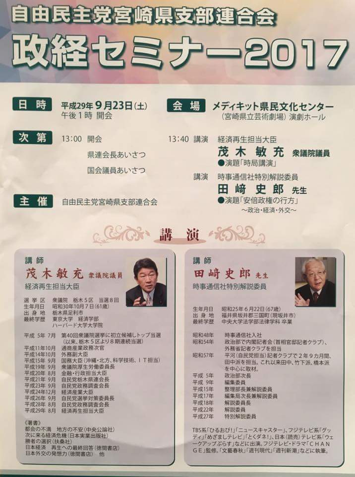 9月23日(祝) メディキット県民文化センターにて、 自由民主党宮崎県支部連合会主催による「政経セミナー2017」 を開催しました。